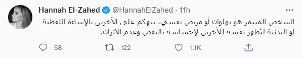 حيث علقت هنا الزاهد قائلة : “ الشخص المتنمر هو بهلوان أو مريض نفسي، يتهكم على الآخرين بالإساءة اللفظية أو البدنية ليُظهر نفسه للآخرين لإحساسه بالنقص وعدم الاتزان ” .