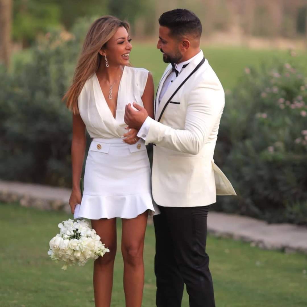 وتألقت علياء بسيوني زوجة الفنان أحمد سعد بإطلالة رقيقة، مرتدية بلوزة باللون الأوف وايت مع جيب قصيرة فوق الركبة باللون الأبيض.