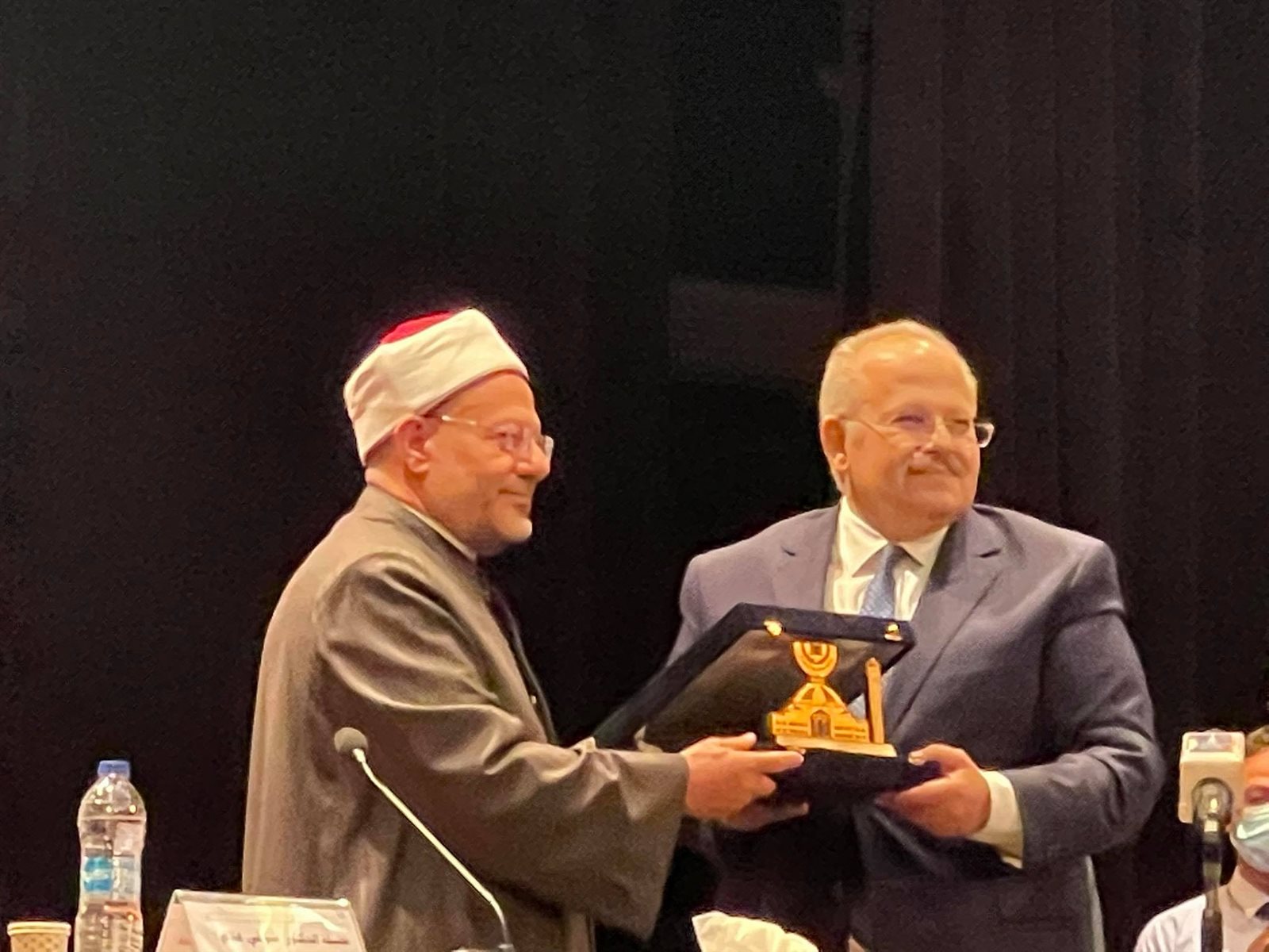 وكرم الدكتور محمد عثمان الخشت رئيس جامعة القاهرة، الدكتور شوقي علام، مفتي الجمهورية، وأهداه درع الجامعة وشكر المفتي كل من أعضاء هيئة التدريس والعاملين بالجامعة.