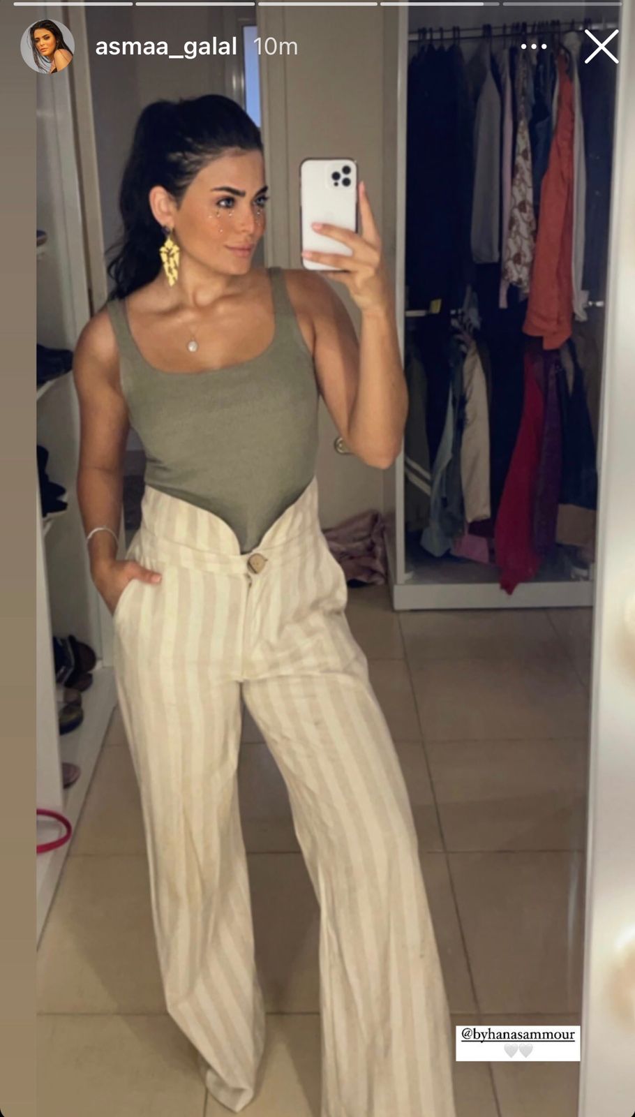 وظهرت أسماء جلال ، في أحدث ظهور لها عبر خاصية “الاستوري” باطلالة فاتنة، مرتدية توب كات باللون الزيتي، مع بنطلون باللونين البيج والأبيض.