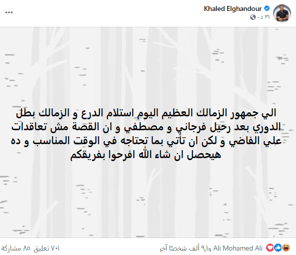 وكتب الغندور: «إلي جمهور الزمالك العظيم.. اليوم استلام الدرع، والزمالك بطل الدوري بعد رحيل فرجاني ومصطفي، وأن القصة مش تعاقدات علي الفاضي، ولكن أن تأتي بما تحتاجه في الوقت المناسب، وده هيحصل إن شاء الله أفرحوا بفريقكم».