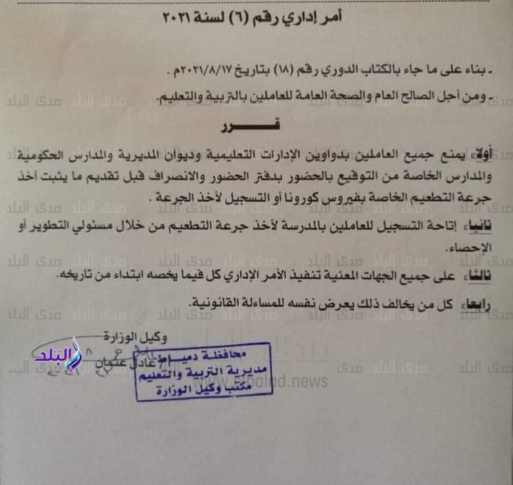 أصدرت مديرية التربية والتعليم بدمياط، تعليمات رسمية للمدارس الحكومية والخاصة وجميع دواوين الإدارات التعليمية، شددت خلالها على عدم السماح بالتوقيع في دفاتر الحضور والانصراف قبل تقديم ما يثبت التطعيم بجرعة لقاح كورونا أو التسجيل لأخذ الجرعة.