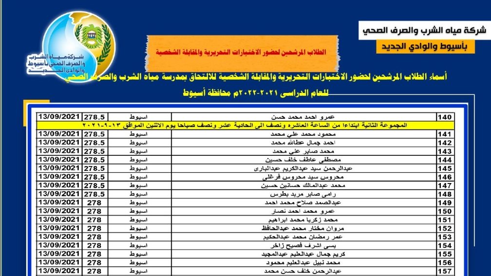 وأوضحت أنه تم حصر أسماء الطلاب المرشحين لحضور الاختبارات الالكترونية والمقابلة الشخصية علي أن تُعقد الاختبارات بشركة مياه الشرب ببني سويف للمشاركين بمدرسة مياه الشرب والصرف الصحي للعام الدراسي ٢٠٢١ / 2022 ببنى سويف طبقا لمواعيد الجدول المرفق بالصفحة طبقا لمحافظات وجه قبلي.