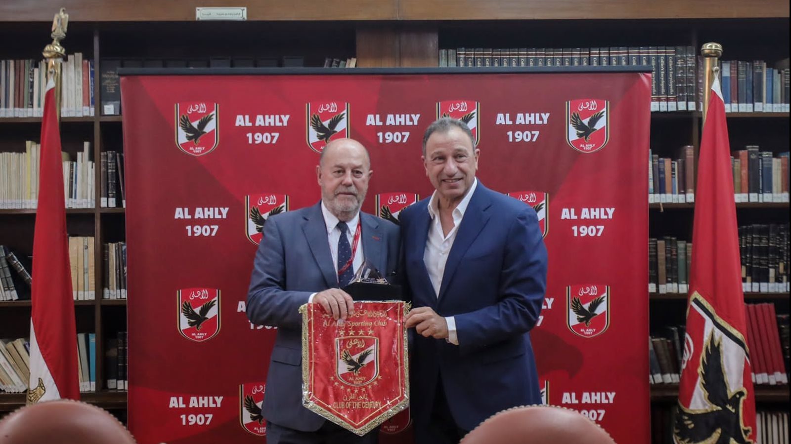 قام محمود الخطيب، رئيس النادي الأهلي، قام بإهداء درع وعلم النادي إلى وفد الاتحاد الدولي للكاراتيه خلال زيارته الرسمية اليوم إلى مقر النادي بالجزيرة.