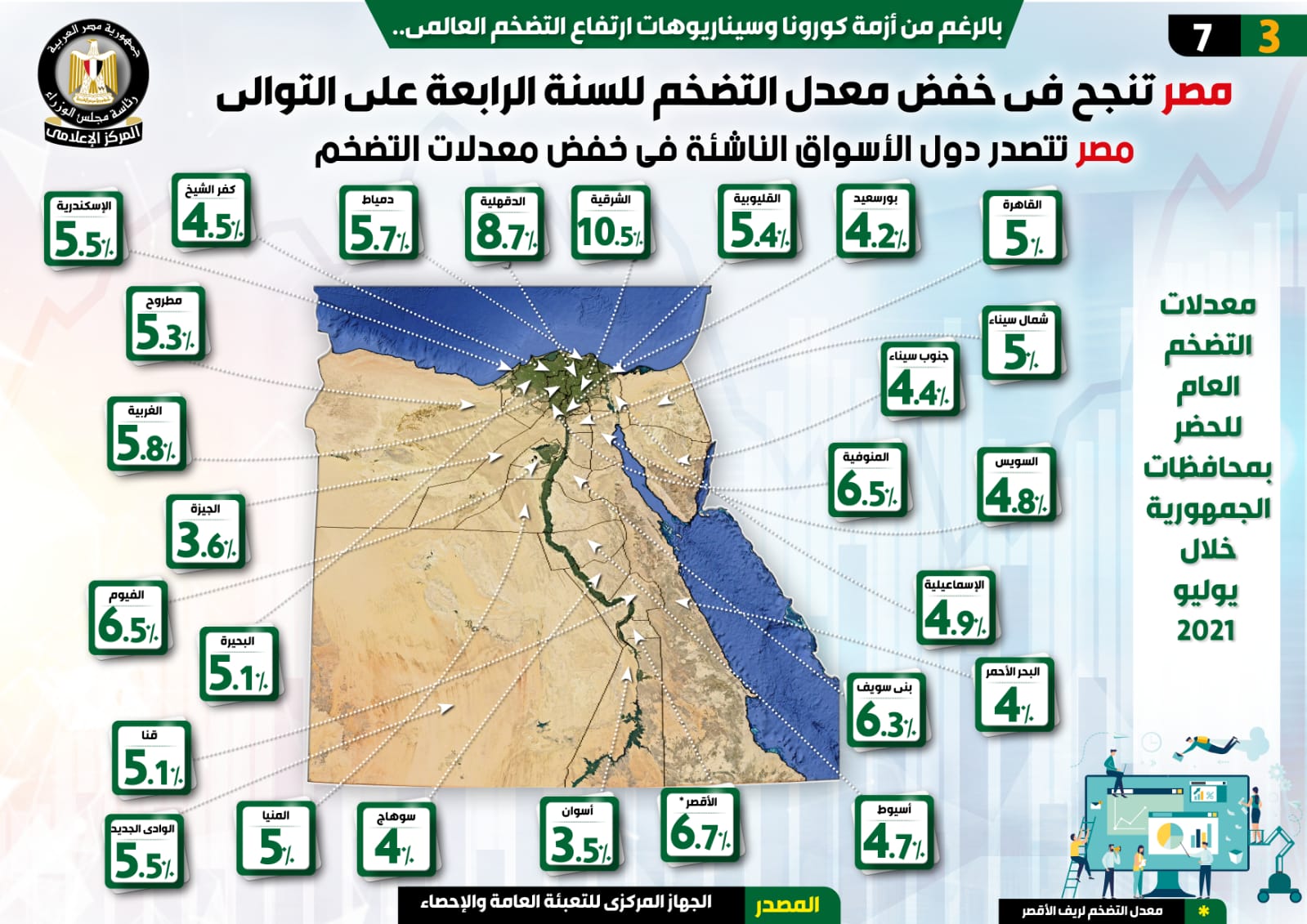 هذا وقد تم للمرة الأولى داخل التقرير نشر معدل التضخم العام للحضر بمحافظات الجمهورية وذلك خلال يوليو 2021، حيث سجل 5% بمحافظات القاهرة والمنيا وشمال سيناء، و5,1% في كل من البحيرة وقنا، و5,5% في كل من الإسكندرية والوادي الجديد، و4% في كل من البحر الأحمر وسوهاج، و4,2% في بورسعيد، و5,4% في القليوبية، و4,4% في جنوب سيناء.