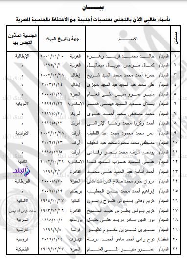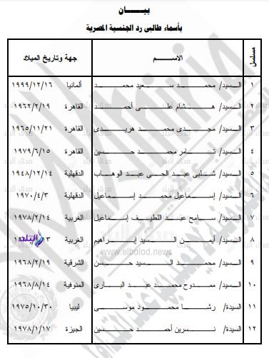 وأصدر وزير الداخلية قرار رقم 1460 لسنة 2021 والمتضمن "رد الجنسية المصرية لـ 12 مواطنا مصريا المدرجة أسماؤهم في البيان التالي".