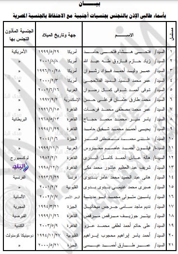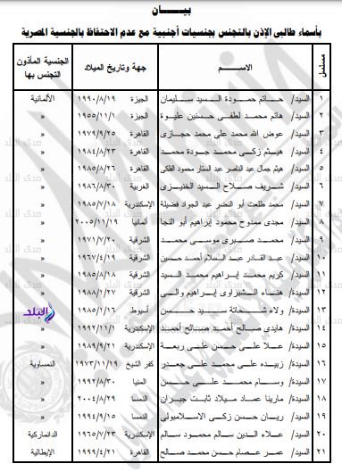 وايضا أصدر وزير الداخلية قرار رقم 1459 لسنة 2021 والمتضمن "الإذن لـ 21 مواطنا المدرجة أسماؤهم بالبيان التالي بالتجنس بالجنسية الأجنبية الموضحة قرين اسم كل منهم، مع احتفاظهم بالجنسية المصرية".