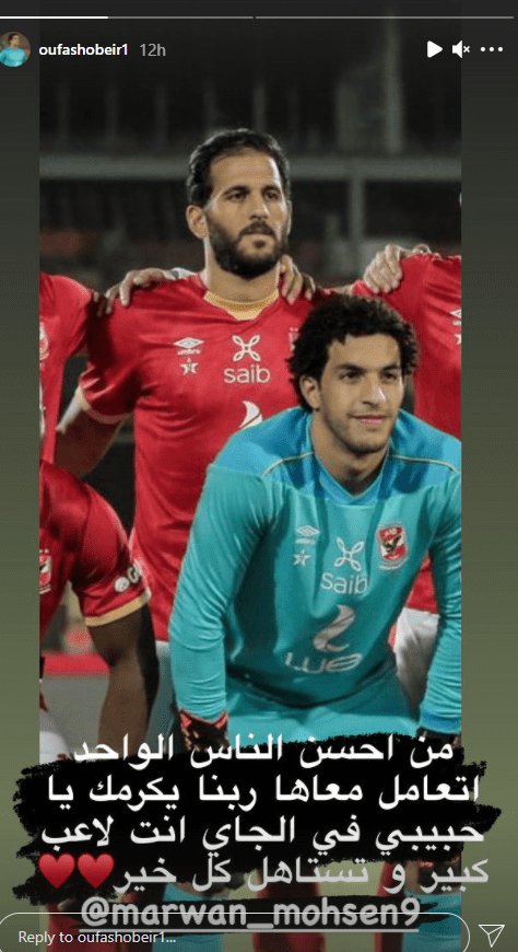 ونشر مصطفى شوبير صورة له مع مروان محسن عبر خاصية استورى بموقع انستجرام ، وكتب : من احسن الناس الواحد اتعامل معها ربنا يكرمك ياحبيبى فى الجاى وانت لاعب كبير وتستاهل كل خير ".