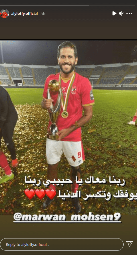ونشر على لطفى صورة لـ مروان محسن عبر موقع انستجرام من خلال خاصية استورى ، وكتب “ ربنا معاك ياحبيبى ربنا يوفقك وتكسر الدنيا ”.