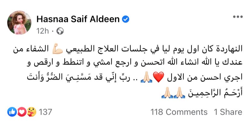 وكتبت حسناء سيف الدين :" النهاردة كان أول يوم ليا فى العلاج الطبيعى ، الشفاء من عندك يالله إن شاء الله أتحسن وأرجع أمشى واتنطط وارقص وأجرى أحسن من الأول ".