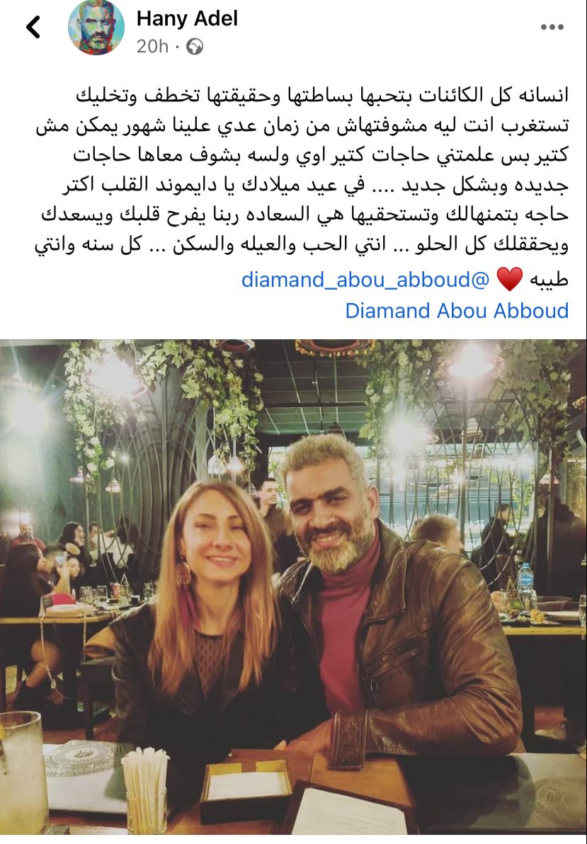 وجه الفنان هاني عادل رسالة رومانسية إلى زوجته الفنانة اللبنانية دياموند بو عبود احتفالا بـ عيد ميلادها.