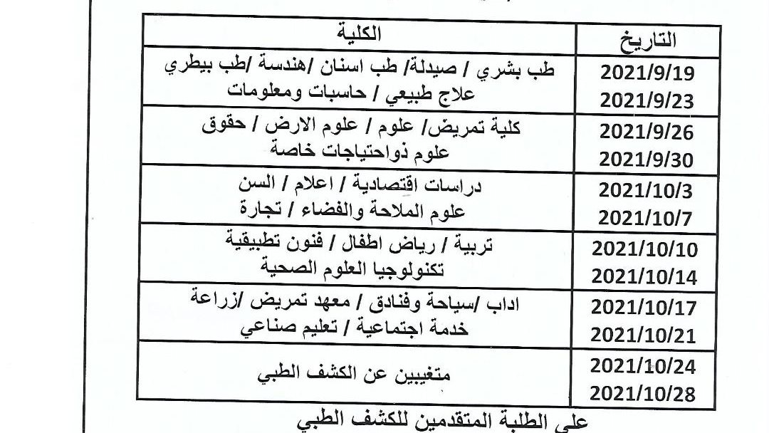 فيما أعلنت الإدارة الطبية بالجامعة عن الجدول الزمنى لكافة الكليات، حيث يبدأ الكشف الطبي ابتداءً من يوم 19 -23 سبتمبر الجاري لكليات الطب البشرى، والبيطري، والأسنان، والصيدلة، والهندسة، والعلاج الطبيعي ، و الحاسبات والذكاء الاصطناعي، وفى الفترة من26 -30 سبتمبر الجاري لكليات التمريض، والعلوم ، وعلوم الأرض، والحقوق، وعلوم ذوى الاحتياجات الخاصة، وفى الفترة ما بين 3-7 أكتوبر القادم لكليات الاقتصاد، والإعلام، والألسن، وعلوم الملاحة، والتجارة ، وفى الفترة من 10-14 أكتوبر لكليات التربية، وتربية طفولة، والفنون التطبيقية، وتكنولوجيا العلوم الصحية ، وفى الفترة من 17-21 لكليات الآداب، والسياحة، والمعهد الفني للتمريض، والتكنولوجيا والتعليم، والزراعة، والخدمة الاجتماعية، بينما تم تخصيص الفترة ما بين 24-28 أكتوبر للطلاب المتغيبين عن الموعد المحدد للكشف الطبي.