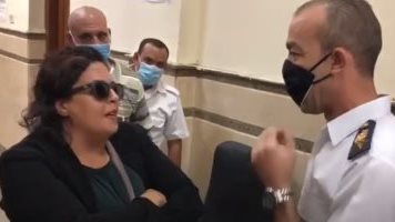 هذا، وكانت "النيابة العامة" قد سألت محاميًا وعاملةً تواجدا بالمحكمة وقت الواقعة فشهدا بمضمون شهادة الضابط المجني عليه، وأكدا تعدى المتهمة عليه بالقول والضرب فضلًا عما أتلفته من منقولات، بينما ادعت المتهمة فى استجوابها أنها كانت تدافع عن نفسها بعدما افتعل الضابط مشادَّة كلامية معها.