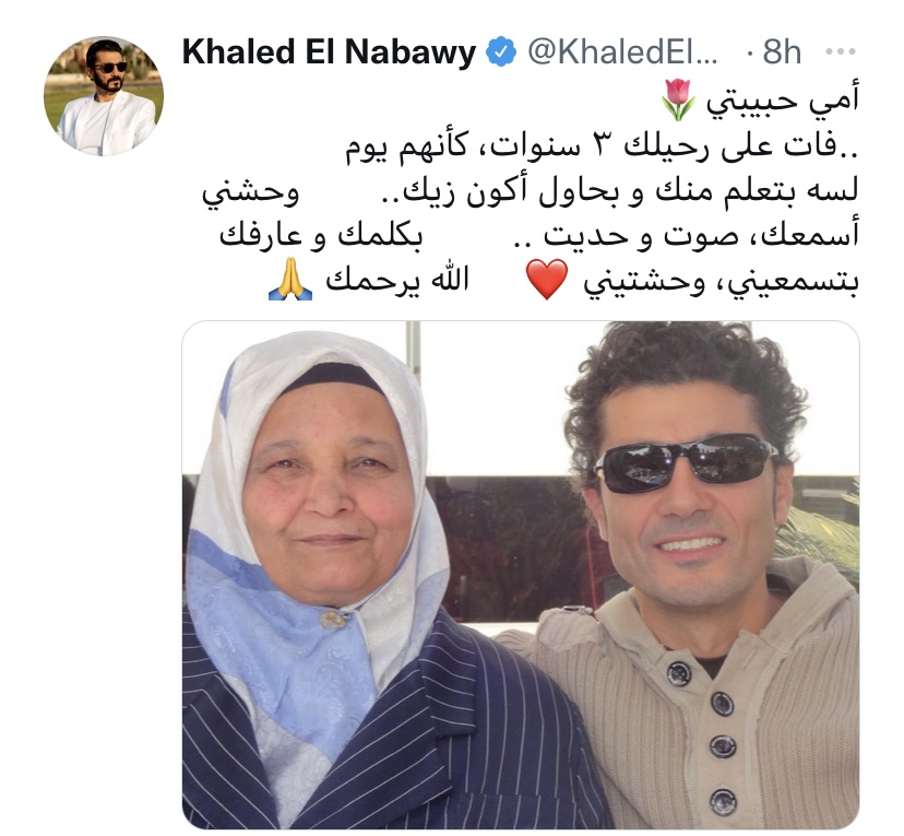 نشر النبوي، صورة له مع والدته عبر حسابه على موقع تويتر معلقا: “أمي حبيبتي، فات على رحيلك ٣ سنوات، كأنهم يوم.. لسه بتعلم منك وبحاول أكون زيك.. وحشني أسمعك، صوت وحديث.. بكلمك وعارفك بتسمعيني، وحشتيني، الله يرحمك”.