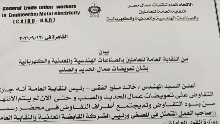 قال خالد الفقي، رئيس النقابة العامة للصناعات المعدنية، إنه مازالت المفاوضات جارية مع وزير قطاع الأعمال بشأن تعويضات تصفية مصنع الحديد والصلب.
