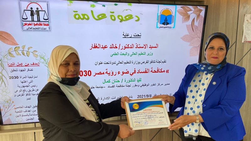 جديد بالذكر أنه قد شاركت الدكتورة حنان كمال مدير مركز التطوير الوظيفي ومقرر لجنه مكافحة الفساد بجامعة حلوان في ندوة حول مكافحة الفساد في ضوء رؤية مصر 2030 والتي نظمتها لجنة تكافؤ الفرص بوزارة التعليم العالي والبحث العلمي بالتعاون مع جامعة حلوان من خلال مركز التطوير الوظيفي.