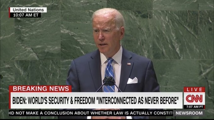 أكد الرئيس الامريكي جو بايدن خلال كلمته أمام الدورة 76 للجمعية العامة للأمم المتحدة أن حل الدولتين أفضل طريقة لحل الصراع الفلسطيني الإسرائيلي، وأنه نبغي مواجهة استخدام الاغتصاب كأداة للحرب في إشارة إلى إثيوبيا.