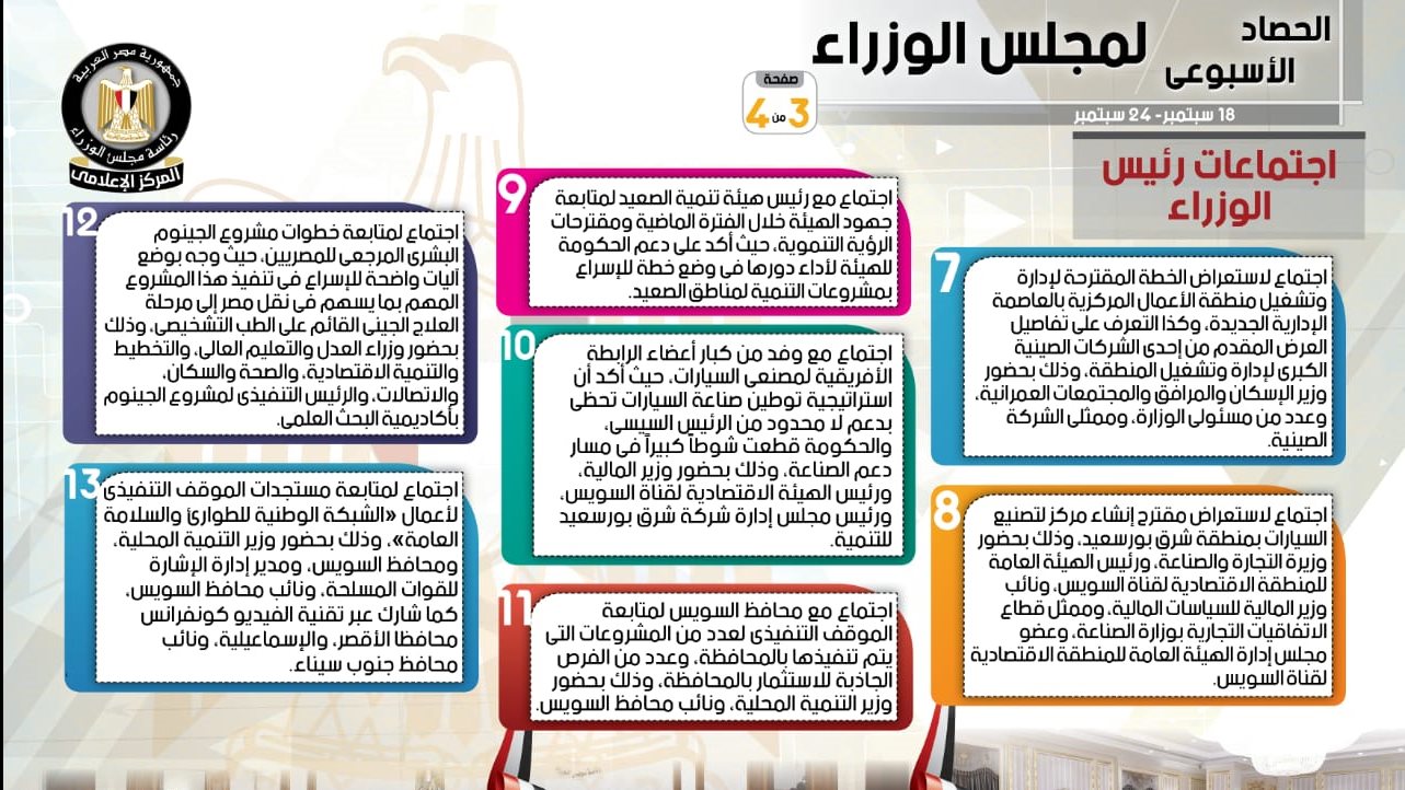 نشر المركز الإعلامي لمجلس الوزراء، تقريراً شمل إنفوجرافات سلط من خلالها الضوء على الحصاد الأسبوعي لمجلس الوزراء، وذلك خلال الفترة من 18 سبتمبر حتى 21 سبتمبر 2021، والذي تضمن الموافقة على عدد من القرارات، فضلاً عن الاجتماعات التي عقدها الدكتور مصطفى مدبولي، رئيس مجلس الوزراء، بالإضافة إلى ما قام به من أنشطة. وجاء في التقرير أنه تم إصدار عدد من القرارات، تشمل الموافقة على مشروع قرار بإعادة تخصيص قطعتي أرض من المساحات المملوكة للدولة بمنطقتي رابعة وبئر العبد، ناحية وسط وشمال سيناء، بإجمالي مساحة 89960.55 فدان، لصالح جهاز مشروعات الخدمة الوطنية لاستخدامهما في أنشطة الاستصلاح والاستزارع، إضافة إلى الموافقة على التعاقد بطريق الإيجار مع شركة الإسكندرية المتحدة لاستصلاح الأراضي (صافولا)، بغرض الاستصلاح والاستزراع لمساحة 20 ألف فدان، تحت ولاية الهيئة العامة لمشروعات التعمير والتنمية الزراعية، الكائنة بناحية غرب المنيا، طبقاً للشروط والضوابط. كما تضمنت القرارات أيضاً الموافقة على اعتماد نتيجة دراسة وزارة المالية المتعلقة بطلب محافظة الفيوم، ووزارة التنمية المحلية، بشأن التصرف بنظام الترخيص بالانتفاع في مساحة 9625 م2 من أملاك الدولة، بقرية بنى أحمد الغربية، بمركز المنيا بالمحافظة، لاستغلالها في إنشاء مجمع خدمي للأنشطة متناهية الصغر والصغيرة والمتوسطة، ضمن مبادرة "شغلك في قريتك"، إلى جانب الموافقة على اعتماد قواعد التسعير للوحدات السكنية التي يتم بيعها لكل من مصابي أسر شهداء القوات المسلحة، والشرطة، والثورة، والحالات الملحة والعاجلة، وبرنامج "الأطفال فاقدي الرعاية" التابع لوزارة التضامن الاجتماعي. وبالإضافة إلى القرارات السابقة، فقد تمت الموافقة على التوصيات الصادرة عن لجان إنهاء المنازعات الحكومية بوزارة العدل، في عدد 29 منازعة، فضلاً عن الموافقة على إسناد أعمال تنفيذ المشروعات الخاصة بتطوير مدينة الغردقة لعدد من الشركات المتخصصة، ومن بين هذه المشروعات طريق المطار "المرحلة الثانية"، وكذا الممشى السياحي، والبوابات الإلكترونية. كما شملت القرارات أيضاً، موافقة رئيس مجلس الوزراء على طلب المستشار رئيس مجلس الدولة، بإصدار عملة متداولة فئة الجنيه الواحد، وسك 7000 قطعة من العملة التذكارية، مصنوعة من الفضة فئة المائة جنيه، بمناسبة اليوبيل الماسي لمجلس الدولة، على أن يتم الإصدار بعد موافقة البنك المركزي. وعلى صعيد الاجتماعات التي عقدها الدكتور مصطفى مدبولي رئيس مجلس الوزراء، أشار التقرير إلى اجتماع مع وزير الاتصالات وتكنولوجيا المعلومات لمتابعة الموقف التنفيذي لعدد من المشروعات التي تعمل عليها الوزارة مثل منصة "مصر الرقمية"، ومشروع الرقم القومي للعقارات، وأعمال البنية التحتية المعلوماتية بالمرحلة العاجلة من المبادرة الرئاسية "حياة كريمة"، بالإضافة إلى عقد اجتماع لمتابعة أعمال وأنشطة "صندوق مصر السيادي" والرؤية المستقبلية له، وخطوات حصر الأصول التي يمكن استثمارها في مختلف القطاعات، وذلك بحضور وزيرة التخطيط والتنمية الاقتصادية، والمدير التنفيذي لصندوق مصر السيادي، وأعضاء مجلس إدارة الصندوق. وتضمنت الاجتماعات أيضاً، وفقاً لما أبرزه التقرير، عقد اجتماع لمتابعة الموقف الخاص بمخططات إنشاء محطات تحلية مياه البحر، ومساعي توطين هذه الصناعة في مصر مرحلياً، وذلك بحضور وزيري التخطيط والتنمية الاقتصادية، والإسكان والمرافق والمجتمعات العمرانية، ونائب وزير الإسكان لشئون البنية الاساسية، والمدير التنفيذي لصندوق مصر السيادي، ومسئولي الصندوق. كما شملت اجتماعات رئيس مجلس الوزراء، وفقاً للتقرير، اجتماعاً مع وزير الإسكان والمرافق والمجتمعات العمرانية؛ لمتابعة آليات صيانة وإدارة وتشغيل عدد من مشروعات العاصمة الإدارية الجديدة، وذلك بحضور رؤساء مجالس إدارات عدد من الشركات الكبرى، بالإضافة إلى عقد اجتماع لاستعراض الخطة المقترحة لإدارة وتشغيل منطقة الأعمال 