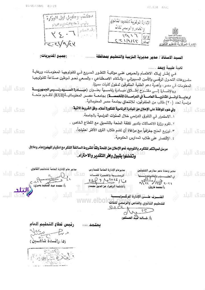 وتقرر تقديم منحة دراسية لـ 20 طالبا من المتفوقين للالتحاق بجامعة مصر المعلوماتية وذلك في إطار الاهتمام والحرص على مواكبة التطور السريع في تكنولوجيا المعلومات، ورعاية مشروعات التحول الرقمي والأمن السيبراني والذكاء الاصطناعي، والسعي نحو توطين صناعة تكنولوجيا المعلومات في مصر وأهمية دعم الطلبة المتفوقين لدخول كليات مميزة.