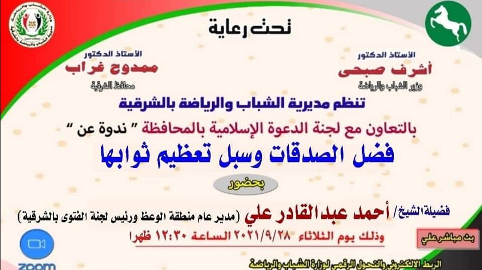 وأشار الدكتور محمود عبد العظيم وكيل وزارة الشباب والرياضة إلى أنه تحت رعاية وزير الشباب والرياضة ومحافظ الشرقية وبالتعاون مع لجنة الدعوة الإسلامية بالمحافظة سوف تقوم المديرية بتنظيم ندوه دينية بعنوان " فضل الصدقات وسبل تعظيم ثوابها " يتم عرضها غداً الثلاثاء الموافق 28 سبتمبر 2021 في تمام الساعة الثانية عشر والنصف ظهراً عن طريق البث المباشر على صفحة مكتب الربط الإلكتروني والتحول الرقمي لوزارة الشباب والرياضة على الفيس بوك وكذلك صفحة مديرية الشباب والرياضة بالشرقية وصفحة لجنة الدعوة الإسلامية بالمحافظة من خلال الروابط التالية: