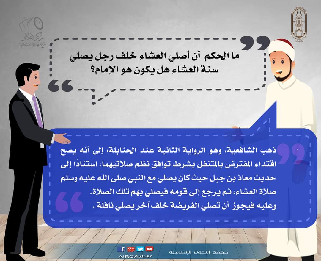 حكم صلاة المفترض خلف المتنفل.. ورد إلى مجمع البحوث الإسلامية بالأزهر الشريف عبر الصفحة الرسمية بموقع التواصل الاجتماعي فيس بوك، سؤالا هذا نصه: ما حكم أن أصلي العشاء خلف رجل يصلي سنة العشاء هل يكون هو الإمام؟