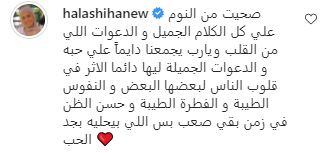 وعلقت حلا شيحة قائلة : صحيت من النوم علي كل الكلام الجميل و الدعوات اللي من القلب و يارب يجمعنا دايماً علي حبه و الدعوات الجميلة ليها دائما الأثر في قلوب الناس لبعضها البعض و النفوس الطيبة و الفطرة الطيبة و حسن الظن في زمن بقي صعب بس اللي بيحليه بجد الحب".