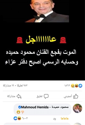 نشر الفنان محمود حميدة تعليقا عبر صفحته على موقع التواصل الاجتماعى فيسبوك يرد فيه عن شائعة وفاته والتى انتشرت فى الساعات القليلة الماضية.