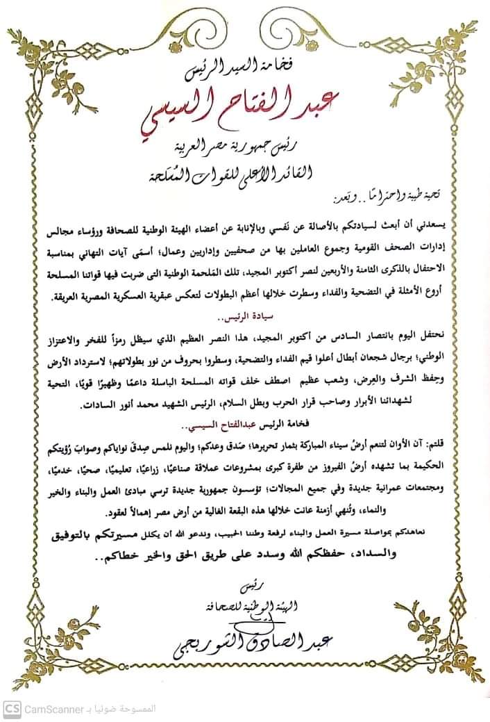 بعث عبد الصادق الشوربجى رئيس الهيئة الوطنية للصحافة ببرقية تهنئة للرئيس عبد الفتاح السيسي رئيس الجمهورية القائد الأعلى للقوات المسلحة بمناسبة الاحتفال بالذكري الثامنة والأربعين لانتصارات أكتوبر المجيدة.