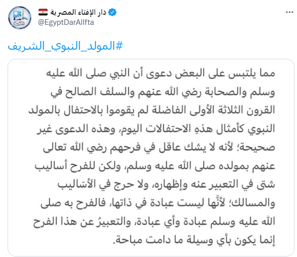 وقالت دار الإفتاء، فى تدوينه على الحساب الرسمي لها بموقع "تويتر" ، ردا على الجدل الذي يدور كل عام حول تحريم الاحتفال بالمولد النبوي: "مما يلتبس على البعض دعوى أن النبي صلى الله عليه وسلم والصحابة رضى الله عنهم والسلف الصالح في القرون الثلاثة الأولى الفاضلة، لم يقوموا بالاحتفال بالمولد النبوي كأمثال هذه الاحتفالات اليوم، وهذه الدعوى غير صحيحة، لأنه لا يشك عاقل في فرحهم رضى الله تعالى عنهم بمولده صلى الله عليه وسلم، ولكن للفرح أساليب شتى في التعبير عنه وإظهاره، ولا حرج في الأساليب والمسالك لأنها ليست عبادة في ذاتها، فالفرح به صلى الله عليه وسلم عبادة وأي عبادة، والتعبير عن هذا الفرح أنما يكون بأي وسيلة ما دامت مباحة".