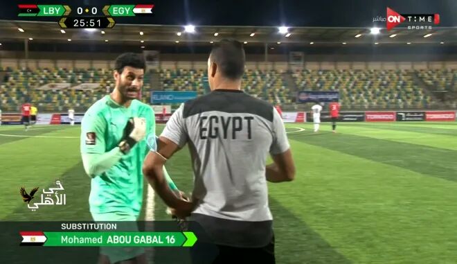 ودفع مدرب المنتخب، بـ محمد أبوجبل فى الدقيقة 27، وأثناء خروج محمد الشناوي ظهر عليه الغضب وعاتب عصام الحضري بأنه شارك فى مباراة اليوم.