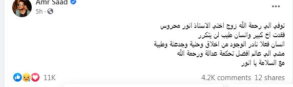 نعى الفنان عمرو سعد عبر صفحته الشخصية على موقع التواصل الاجتماعى فيسبوك زوج شقيقته.