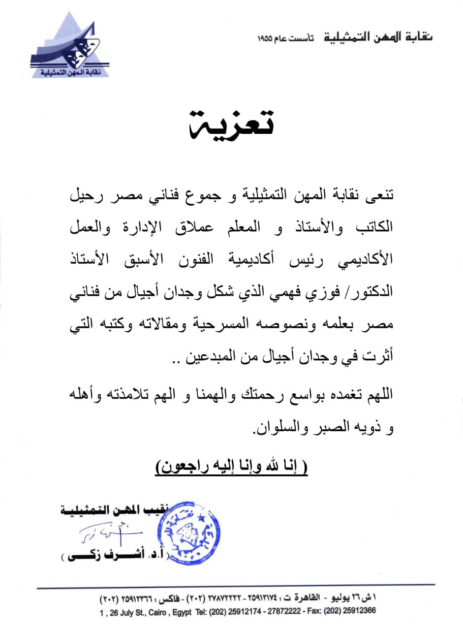 وجاء بيان نقابة المهن التمثيلية على النحو التالي " تنعي نقابة المهن التمثيلية وجموع فناني مصر الكاتب والأستاذ رئيس أكاديمية الفنون الأسبق الأستاذ الدكتور فوزي فهمي الذي شكل وجدان الأجيال من فناني مصر بعلمه ونصوص مسرحياته وكتبه التي اثرت في وجدان أجيال من المبدعين".