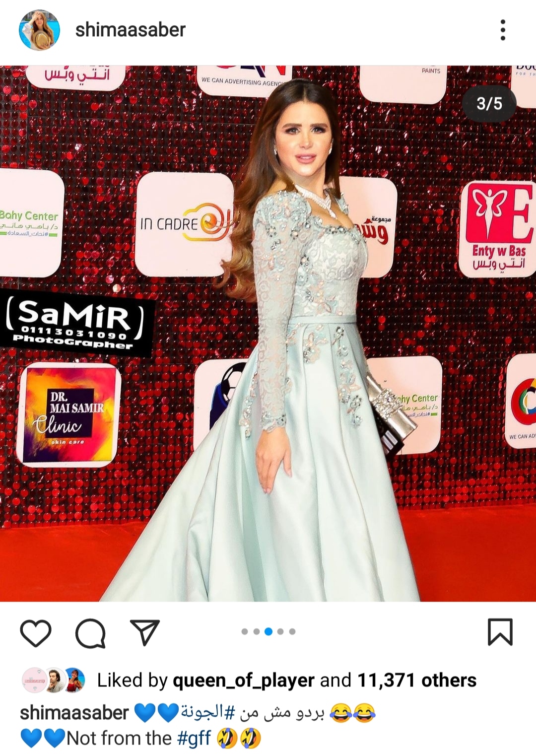 وظهرت شيما صابر، بإطلالة جذابة، مرتدية فستانا أنيقا، وعلقت شئنا صابر ساخرة" بردو مش من الجونة".