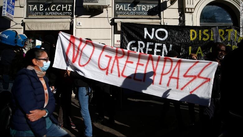 وحملت المظاهرات شعار لن تعود الفاشية مرة أخرى كما لوح بعض المشاركين بأعلام كتب عليها نعم للقاح وهو رد مباشر على المتظاهرين الذين دمروا مقر نقابة سغيل الأقدم في إيطاليا في 9 أكتوبر الجاري باستخدام عصي وقضبان معدنية.