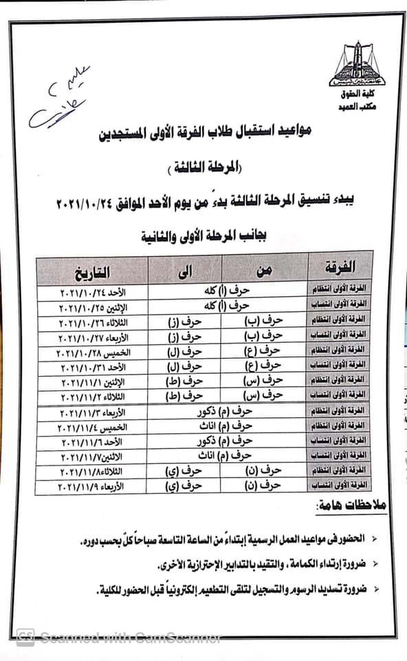 كشف الدكتور ناجي عبد المؤمن عميد كلية حقوق جامعة عين شمس عن مواعيد استقبال طلاب الفرقة الاولي المستجدين (المرحلة الثالثة )، منوها إلى أن تنسيق هذه المرحلة سوف يبدأ اعتبارا من يوم الأحد الموافق 24 ديسمبر 2021 بجانب المرحلة الاولي والثانية.