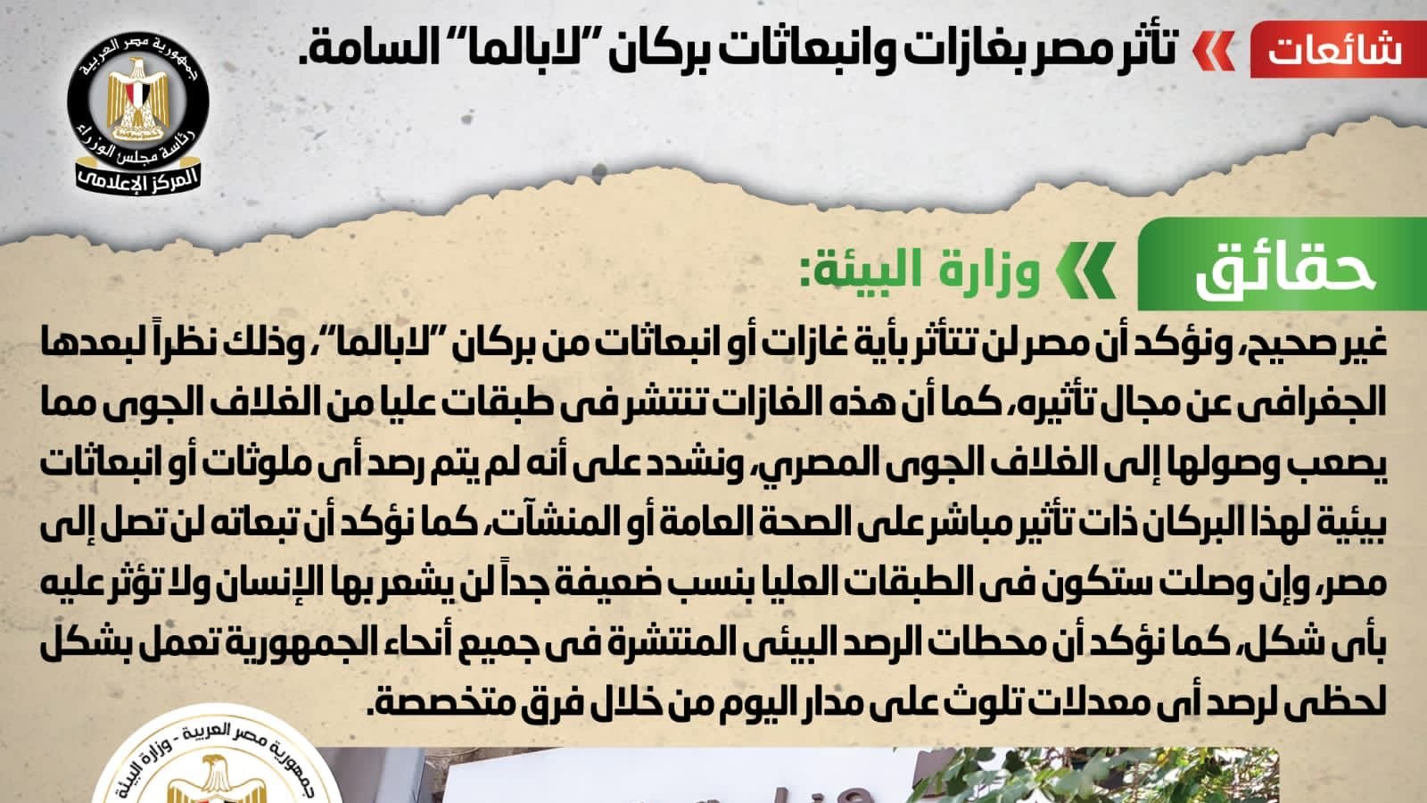 وأكدت الوزارة، أنه لا صحة لتأثر مصر بغازات وانبعاثات بركان "لابالما" السامة، وأن مصر لن تتأثر بأية غازات أو انبعاثات من بركان "لابالما"، وذلك نظراً لبعدها الجغرافي عن مجال تأثيره، كما أن هذه الغازات تنتشر في طبقات عليا من الغلاف الجوي مما يصعب وصولها إلى الغلاف الجوي المصري، ونشدد على أنه لم يتم رصد أي ملوثات أو انبعاثات بيئية لهذا البركان ذات تأثير مباشر على الصحة العامة أو المنشآت.