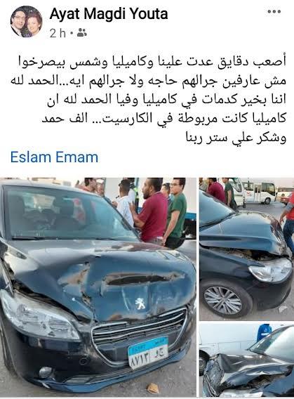 وقالت آيات مجدى : “أصعب دقايق عدت علينا و(كاميليا وشمس) بيصرخوا مش عارفين جرالهم حاجة ولا جرالهم إيه، الحمد لله أننا بخير، كدمات في كاميليا وفيا، الحمد لله إن كاميليا كانت مربوطة في الكارسيت، ألف حمد وشكر على ستر ربنا”.