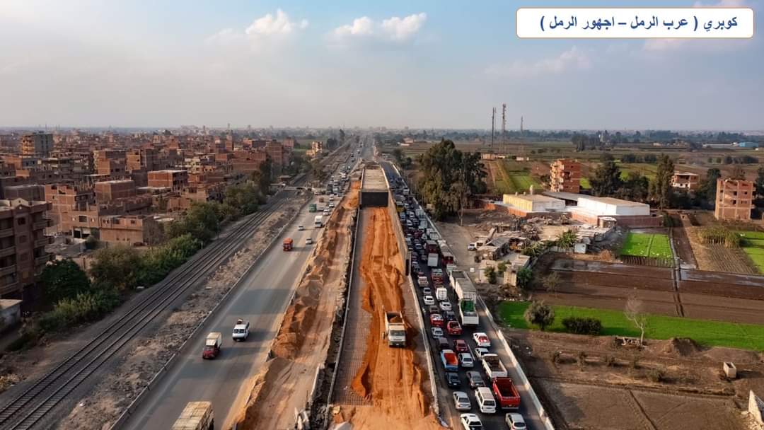 كما سيتم تنفيذ كوبري عرب الرمل العلوى – اجهور الرمل حيث يتم تنفيذ كوبرى علوى بطول 1500م بواقع 3 حارات مرورية لكل اتجاة بإجمالى 24 مترا.