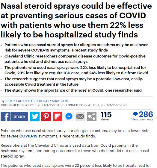 ويتم استخدام بخاخات الستيرويد الأنفية لتخفيف الحساسية والربو وأمراض الأنف الأخرى، ولكن لاحظ الباحثون أن المرضى الذين استخدموا بخاخات الستيرويد الأنفية كانوا أقل عرضة للإصابة بأعراض فيروس كورونا المستجد Covid.