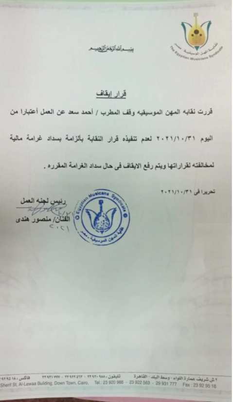 وجاء نص البيان: «وقف قرار الإيقاف للمطرب أحمد سعد، حيث أُصدر قرار إيقاف للمطرب؛ على خلفية قيامه بحفل في الساحل الشمالي، مخالفا قرار النقابة بعدم الالتزام بعدد العازفين، وكانت النقابة قد غرمته مبلغا قدره عشرون ألف جنيه، ولم يتم سداد مبلغ الغرامة حتي صدور قرار الإيقاف اليوم ٢٠٢١/١٠/٣١».