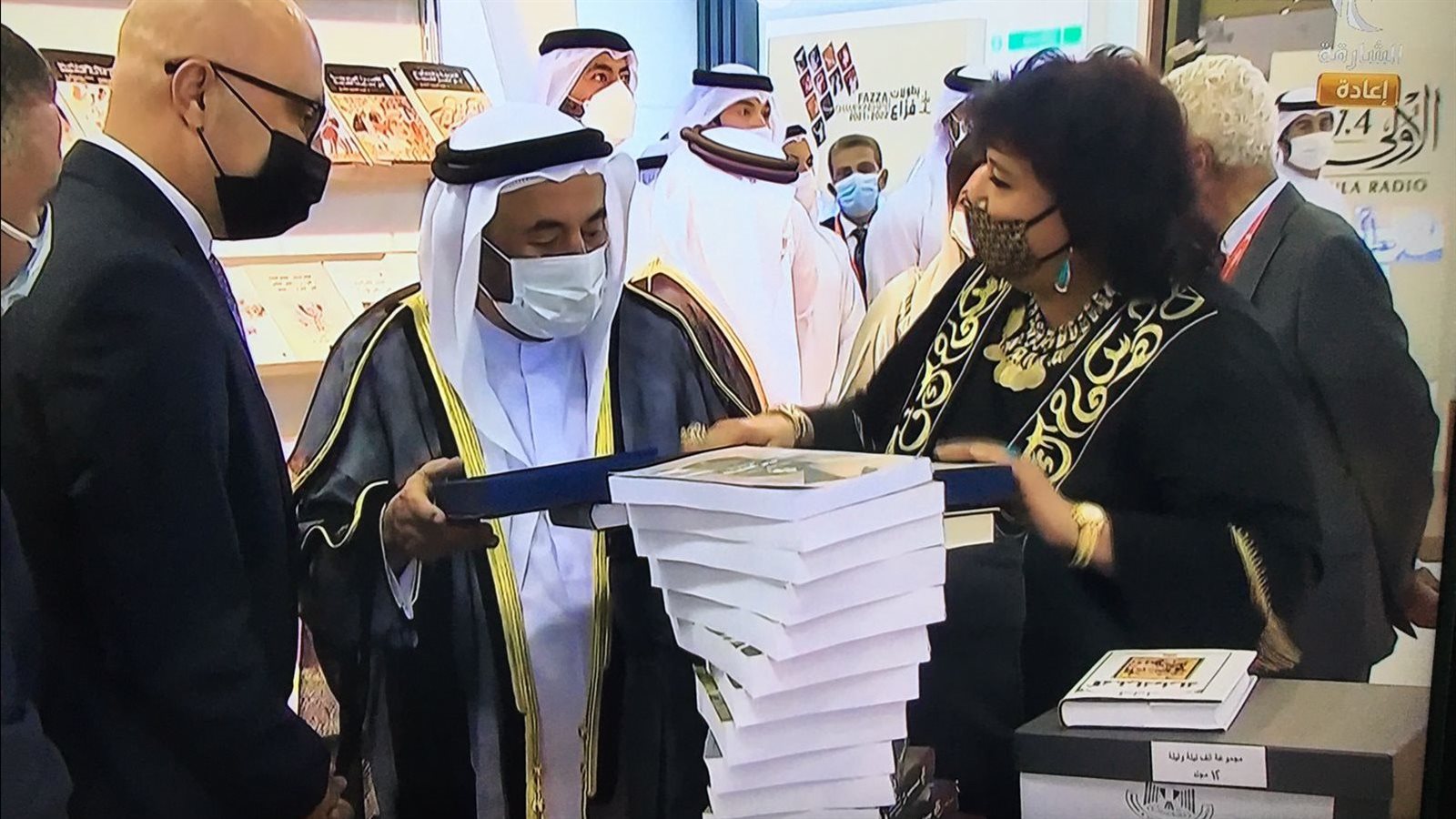 وخلال الافتتاح تفقدت وزيرة الثقافة وحاكم الشارقة جناحا الهيئة المصرية العامة للكتاب ودار الكتب والوثائق القومية المشاركان فى هذه الدورة كممثلان لوزارة الثقافة واهدته نسخة خاصة من موسوعة مصر القديمة لسليم حسن، واخرى من ألف ليلة وليلة طبعة دار الكتب والوثائق القومية، إضافة إلى الإصدار الوثائقي من كتاب مشاركات مصر الدولية في الاكسبو منذ تاسيسه والذي يعرض حاليا بإكسبو دبي كما اطلعته على أحدث إصدارات الهيئة العامة للكتاب والمشاريع المستقبلية التي تسهم بها وزارة الثقافة المصرية في تعزيز الهوية وبناء الوعي حيث اقيم جناح هيئة الكتاب على مساحة 36 مترا ويضم أحدث إصدارتها مثل موسوعة المضللون لمحمد الباز ، موسوعة الحضارة الفرعونية للنشء ، أحداث إصدارات سلسلتى ما ورؤية بالإضافة إلى العديد من العناوين الفكرية والإبداعية التي تصدرها الهيئة .
