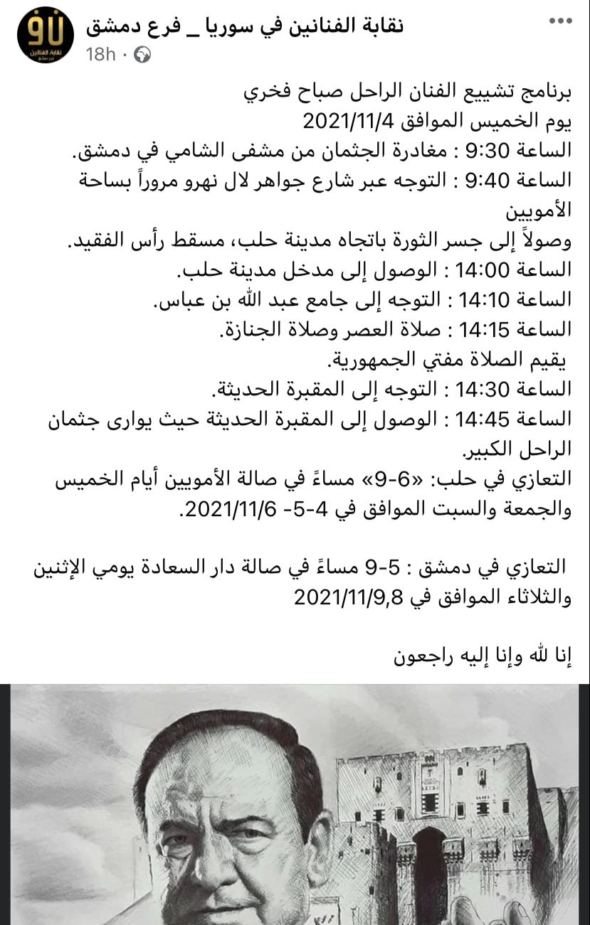 وكتبت نقابة الفنانيين السورين عبر صفحتها بـ “فيسبوك”:"برنامج تشييع الفنان الراحل صباح فخري