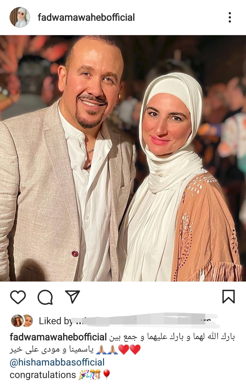وأكدت مصممة الأزياء فدوى مواهب خبر زفاف ابنة هشام عباس ، بنشرها صورة لها مع الأخير، وباركت له زفاف ابنته ياسمينا.