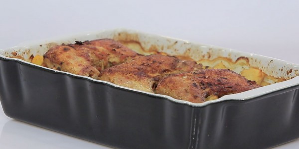 1- يقطع الدجاج شرائح مع الفلفل الملون والبصل