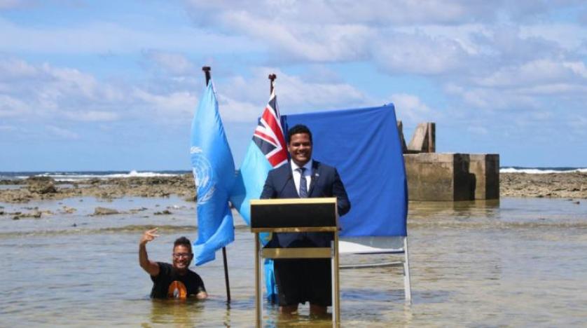 وفي بيان مسجل مسبقًا صورته محطة TVBC العامة، خاطب وزير الخارجية سيمون كوفي الكاميرات بينما كان في عمق الركبة في المحيط لتسليط الضوء على ارتفاع مستوى سطح البحر الذي يؤثر على دول المحيط الهادئ مثل دولته، وفق ما نقلته إذاعة «إس بي إس» الأسترالية.