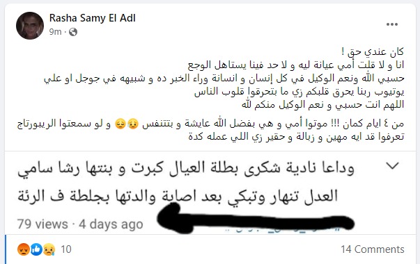 وأضافت رشا سامي العدل : "اللهم انت حسبي ونعم الوكيل منكم لله، من 4 أيام كمان!! موتوا أمي وهي بفضل الله عايشة وبتتنفس ولو سمعتوا الربورتاج تعرفوا قد ايه مهين وزبالة وحقير زي اللي عمله كدة".