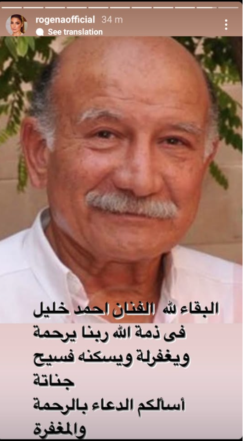 وكتبت روجينا عبر حسابها بموقع التواصل الاجتماعي "انستجرام": البقاء لله الفنان احمد خليل في ذمة الله ربنا يرحمك و يغفرلك و يسكنك فسيح جناته ، اسالكم الدعاء بالرحمة و المغفرة .