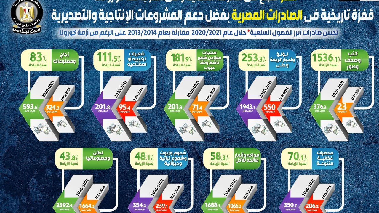 وجاء ذلك بحسب تقرير نشرته الصفحة الرسمية لمجلس الوزراء، الاثنين، ظهر خلاله القفزة الكبيرة التي شهدتها الصادرات المصرية بعد صمودها أمام أزمة التجارة العالمية، لافتا إلى تحسن وضع التجارة الخارجية المصرية خلال عام 2020/2021 مقارنة بعام 2019/2020، حيث زادت قيمة الصادرات بنسبة 18.2%، مسجلة 34.4 مليار دولار عام 2020/2021 مقارنة بـ 29.1 مليار دولار عام 2019/2020.