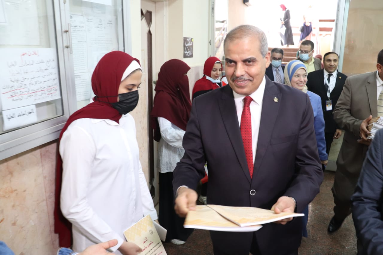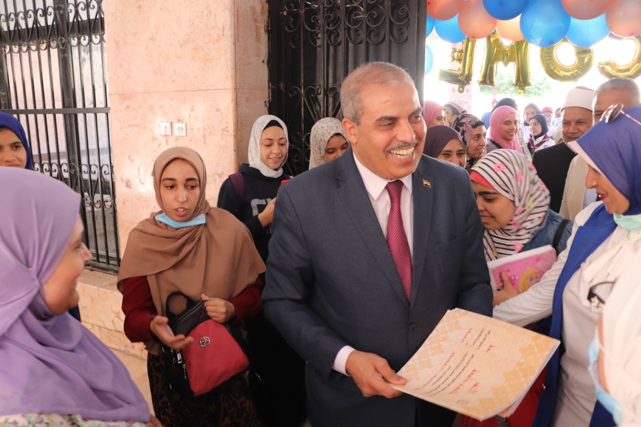 كان في استقبال رئيس الجامعة الدكتورة إلهام عبد الرازق إسماعيل، عميدة الكلية، والدكتورة نشوى الجندي، وكيل الكلية للدراسات العليا والبحوث، والدكتورة لبنى عيد الطيب، وكيل الكلية لشئون التعليم، ولفيف من أعضاء هيئة التدريس وطالبات الكلية القدامى والجدد.