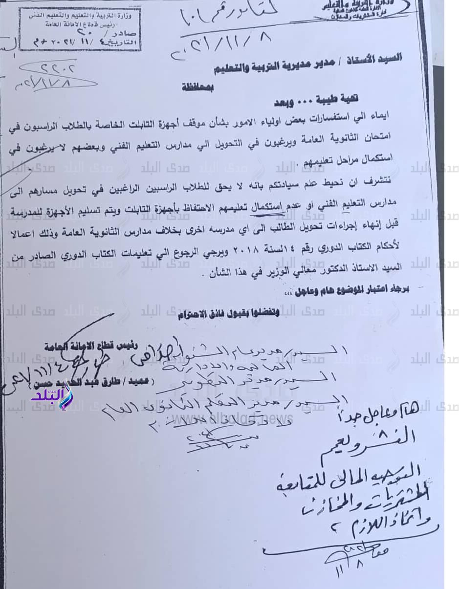 أكدت وزارة التربية والتعليم والتعليم الفني أنه بالنسبة للطلاب الراسبين في الثانوية العامة ويرغبون في التحويل لمدارس التعليم الفني أو لا يرغبون في استكمال مراحلهم التعليمية ، فلا يحق لهؤلاء الطلاب الاحتفاظ بأجهزة التابلت التي تم توزيعها على طلاب مرحلة الثانوية العامة.